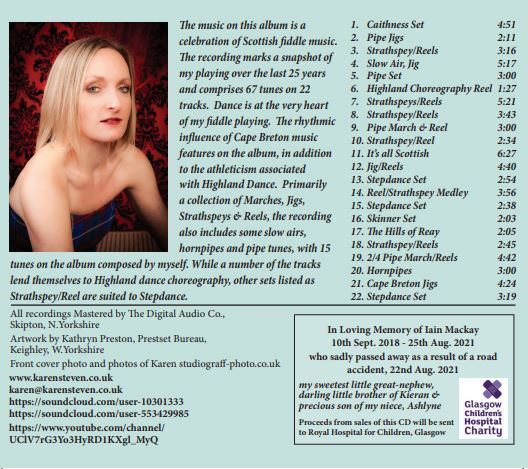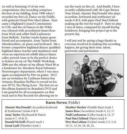 This album is a celebration of my fiddle playing spanning the last 25 years. The album is strongly inspired by dance - Scottish Highland, National and Cape Breton Stepdance. My playing is strong rhythmically and the accompanists I have chosen are equally accomplished in playing for dance. The tunes I have composed that feature on the album were all written in the last 20 years, while 3 of them were written during lockdown 2020. Growing up listening to the highland bagpipes also had a huge impact on my music. I feel like I had a big repertoire of tunes in my head before I even picked up the fiddle and I love the challenge of learning pipe tunes, which are often in 4 parts and have recurring phrase patterns. It is fitting that piper, Paul MacLelland from Canada appears on this cd. Both he and long-time accordionist friend, Alastair Macdonald came together to record one of my own pipe marches and reels, adding a contrast to the overall sound on the album, which is quite strongly focused on guitar or keyboard accompaniment. Finally, I am hugely grateful to PAN records of Wick, for providing the first track on the album. This is also a set of tunes I composed and featured on Button Box player, Brandon McPhee's DVD, The Flying Scots.